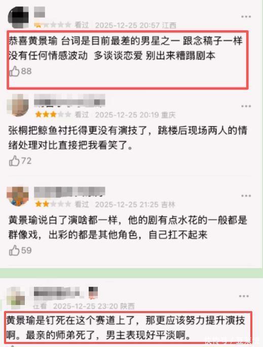 网友吐槽说念:“黄景瑜的台词演技很差,跟念稿子一样,莫得厚谊在内,别奢靡脚本了。” 平直的暗示,张桐把黄景瑜给映衬的,更莫得演技了。